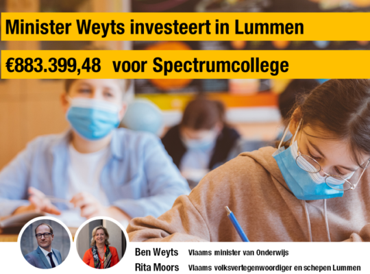 Vlaams minister van Onderwijs Ben Weyts (N-VA) investeert €883.399,48 in het Spectrumcollege in Lummen. “We timmeren verder aan een betere onderwijskwaliteit voor onze leerlingen”, zegt Weyts. “Die onderwijskwaliteit krikken we mee op door te investeren in onze schoolinfrastructuur op verschillende locaties. De nieuwbouwprojecten in deze investeringsgolf geven plaats aan ruim 8166 leerlingen.” “Goed nieuws voor de scholieren van het Spectrumcollege in Lummen”, zegt Vlaams volksvertegenwoordiger en schepen van Lummen Rita Moors.